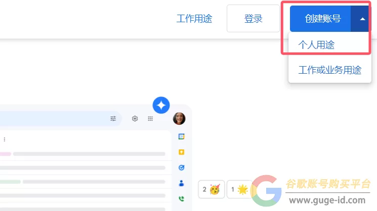 1、进入谷歌邮箱官网( https://gmail.google.com/),点击右上角“创建账号”----“个人用途”按钮。