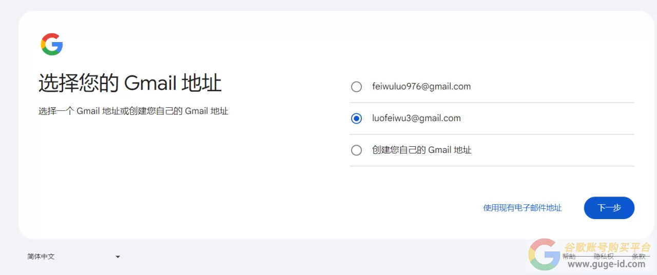 4、选择您的Gmail地址,这可以可以选择系统推荐的,也可以自己自定义一个你喜欢的!